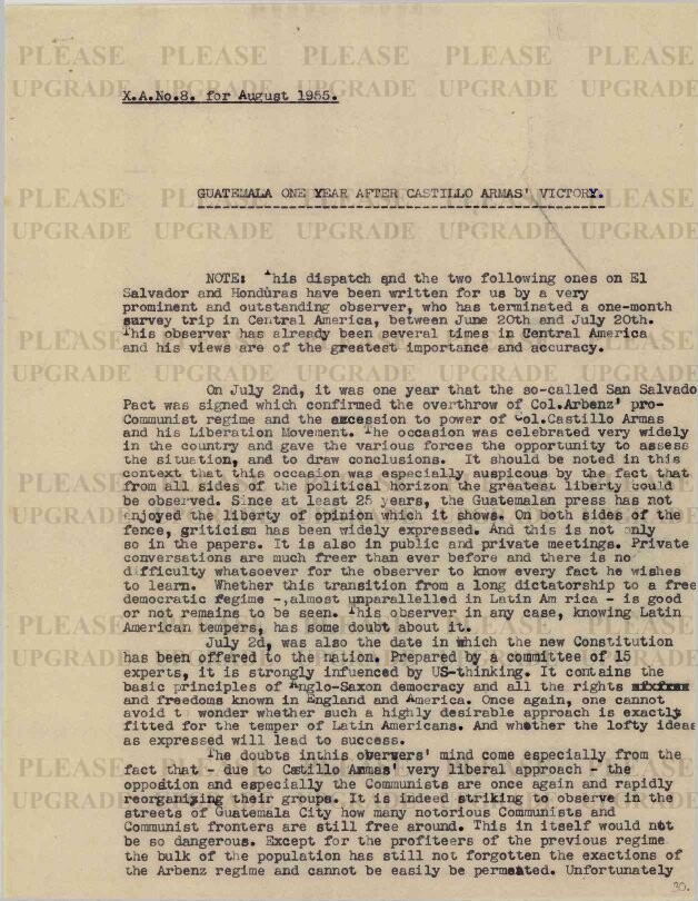 Preview Guatemala One Year after Castillo Armas' Victory Preview Show Metadata Show Permalink Publisher Habsburg Ottó Alapítvány Date 1955-08 Total Pages 5 Collection (HOAL I-7-a) Külpolitikai helyzetjelentések / Dispatches